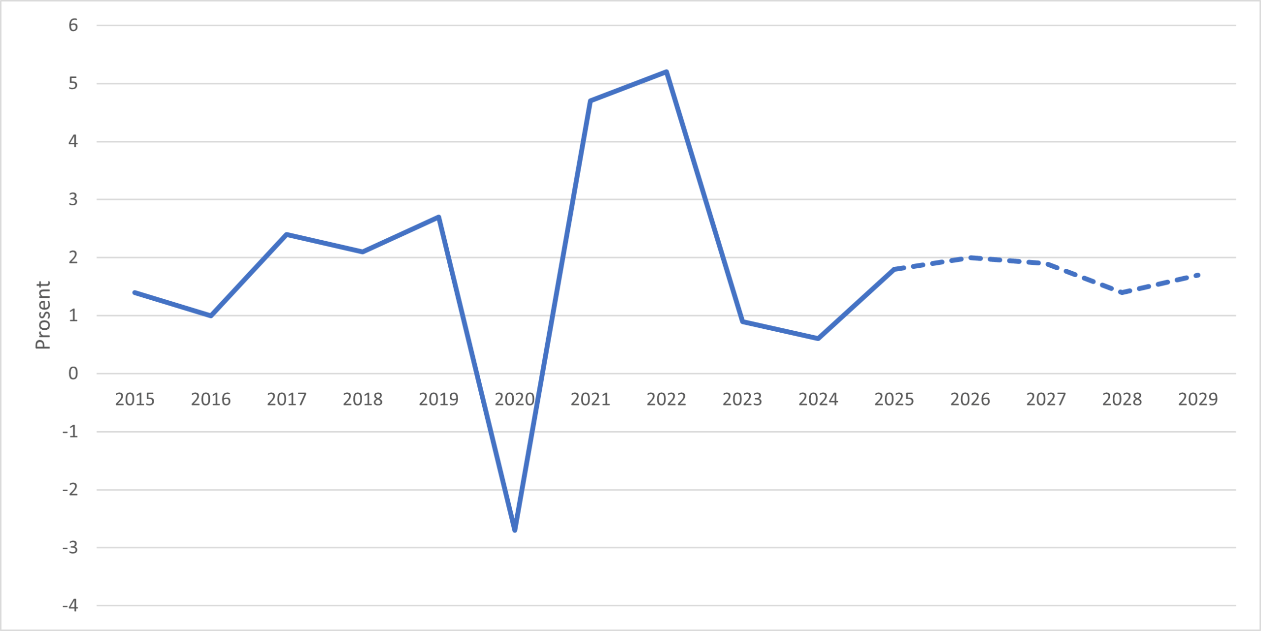 Det var god vekst i bruttonasjonalprodukt på fastlandet våren 2025, og vesentlig bedre enn i de to foregående årene. Det viser Figur 1. Gjennom tredje kvartal var utviklingen relaativt flat, mens veksten tok seg opp igjen mot slutten av året. Samlet sett var veksten i fastlandsøkonomien på 1,8 prosent fra 2024 til 2025.