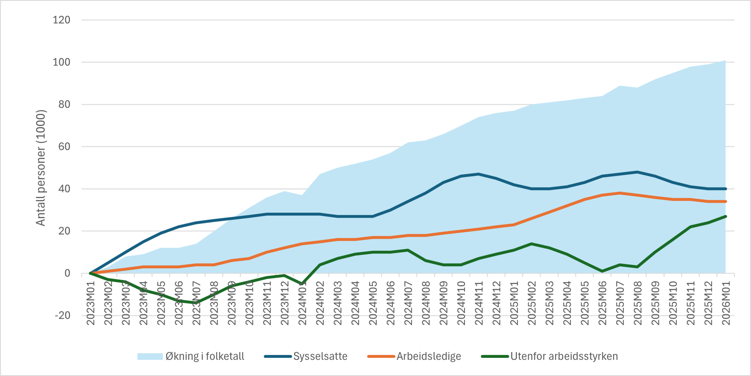 Figur 2 illustrerer disse poengene. Vi er om lag 90 000 flere innbyggere mellom 15 og 74 år i Norge nå, sammenliknet med i januar 2023. Kurvene i figuren illustrerer hvordan størrelsen på gruppene som er henholdsvis sysselsatt, arbeidsledig og utenfor arbeidsstyrken har utviklet seg i samme periode. Økningen i antallet ledige gjennom våren og sommeren sammenfalt med en reduksjon i antallet som står utenfor arbeidsstyrken, og sysselsettingen steg i samme periode.