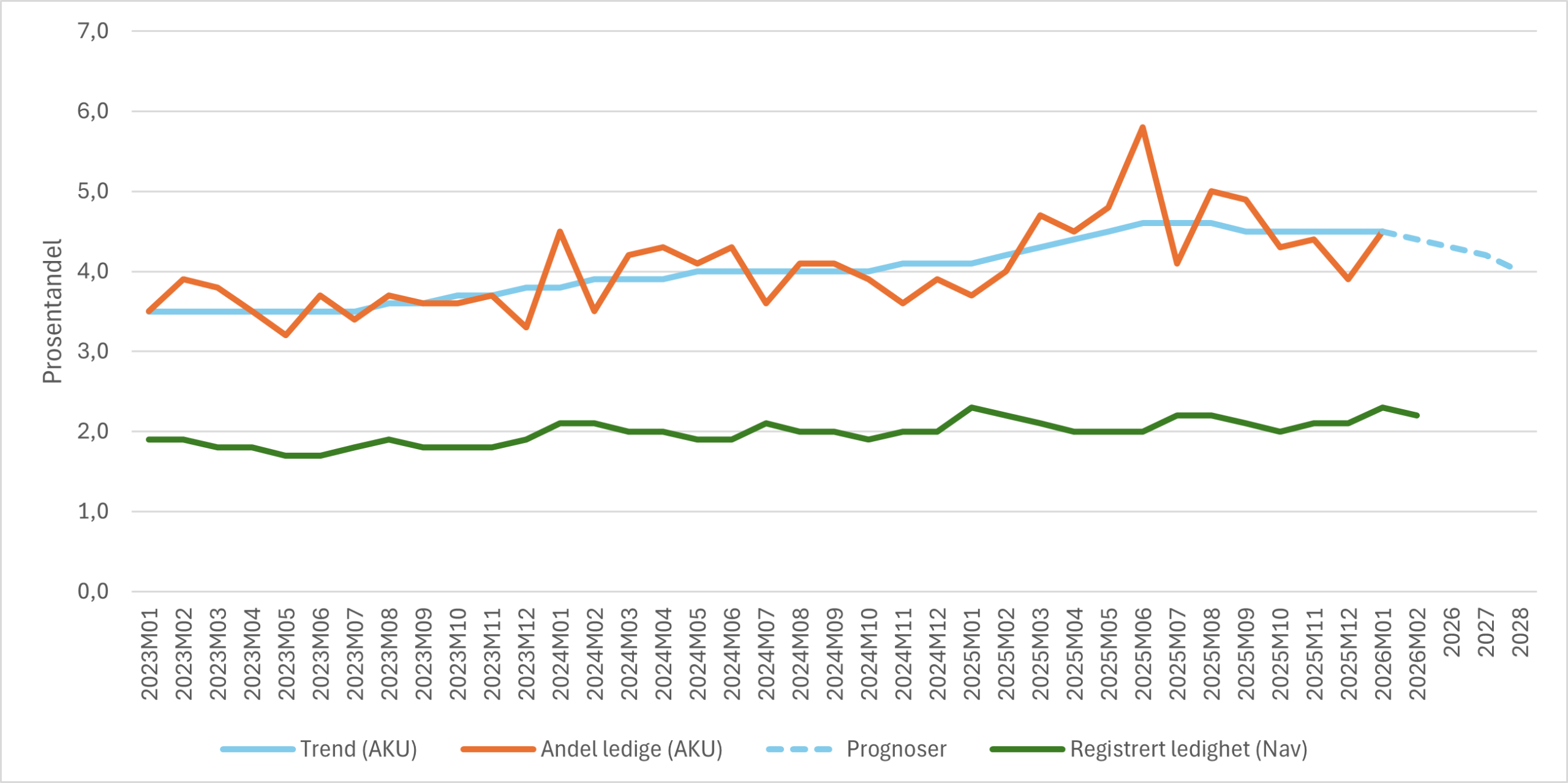 AKU-undersøkelsen er en spørreundersøkelse, og arbeidsledige defineres ut fra hvordan respondenter svarer på ulike spørsmål. Nav-statistikken baserer seg på hvor mange som står registrert som helt ledige i Nav-systemet. Statistikkene måler forskjellige størrelser, og det er ikke noe nytt at AKU-ledigheten ligger høyere enn den registrerte ledigheten. Det som er påfallende er at den registrerte ledigheten (2,1 prosent i november) ligger omtrent 0,5 prosentpoeng lavere enn gjennomsnittet for registrert ledighet de siste 20 årene. Samtidig ligger AKU-ledigheten (4,3 prosent i november) omtrent 0,5 prosentpoeng over sitt eget historiske gjennomsnitt. Mens den registrerte ledigheten har vært svært stabil de siste tre årene har AKU-ledigheten steget betydelig. I løpet av 2025 har trenden for AKU-ledigheten steget fra 4,1 til 4,5 prosent.