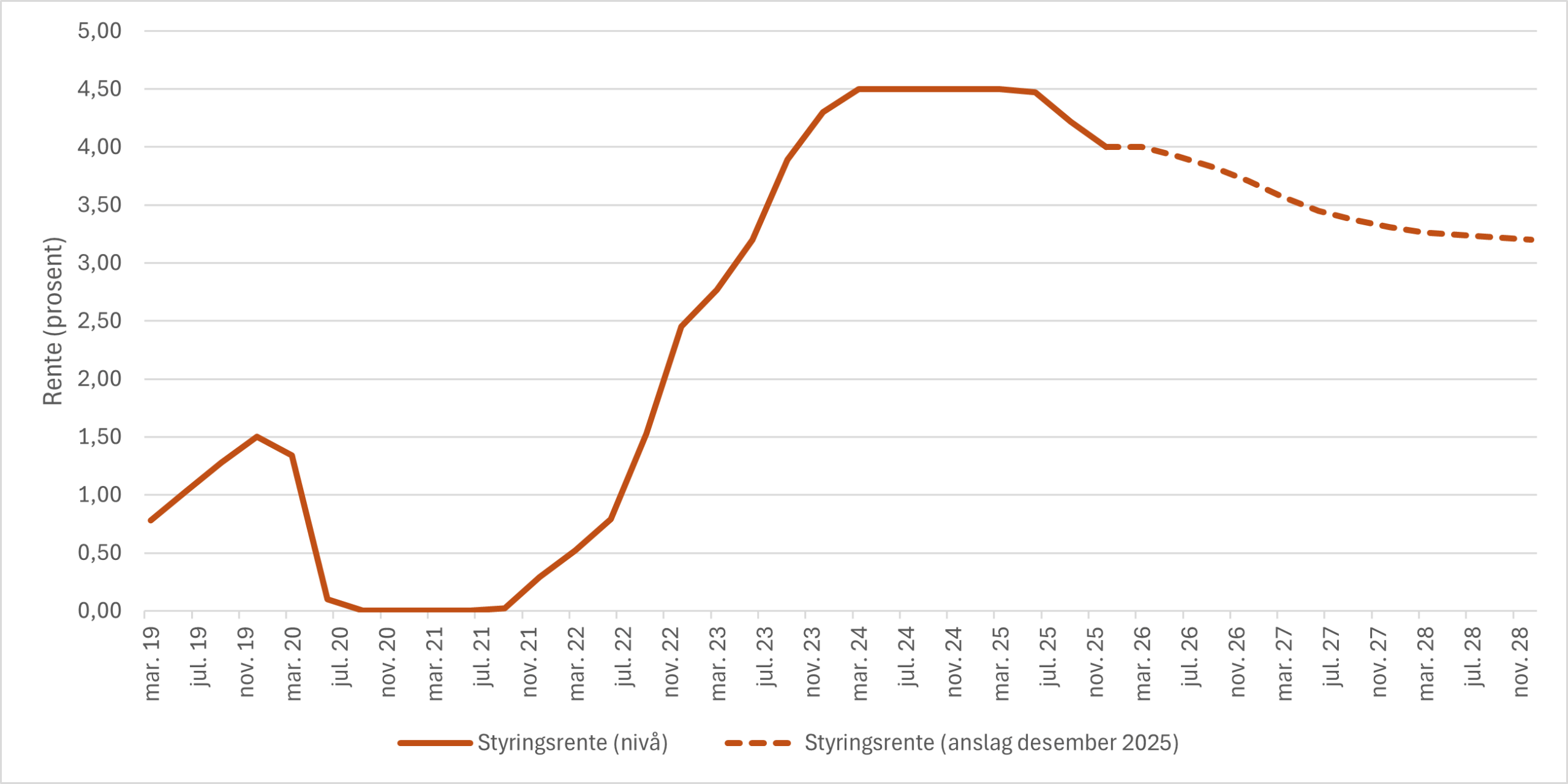 Norges bank setter sentralbankrenta for å oppnå en lav og stabil inflasjon på nær 2 prosent over tid. Rentesettingen skal også bidra til høy og stabil produksjon og sysselsetting. Inflasjonen ligger fortsatt høyere enn Norges banks langsiktige mål. BNP-veksten var noe lavere i tredje kvartal enn det Norges bank hadde forventet, og vi så tegn til mindre press i økonomien. Samtidig var den samlede prisveksten (KPI) noe høyere enn antatt. Norges bank responderte i desember på dette med å la styringsrenten ligge fast på 4 prosent, og å la anslagene på renteutviklingen framover være mer eller mindre uendret fra anslagene de lagde i septemer.
