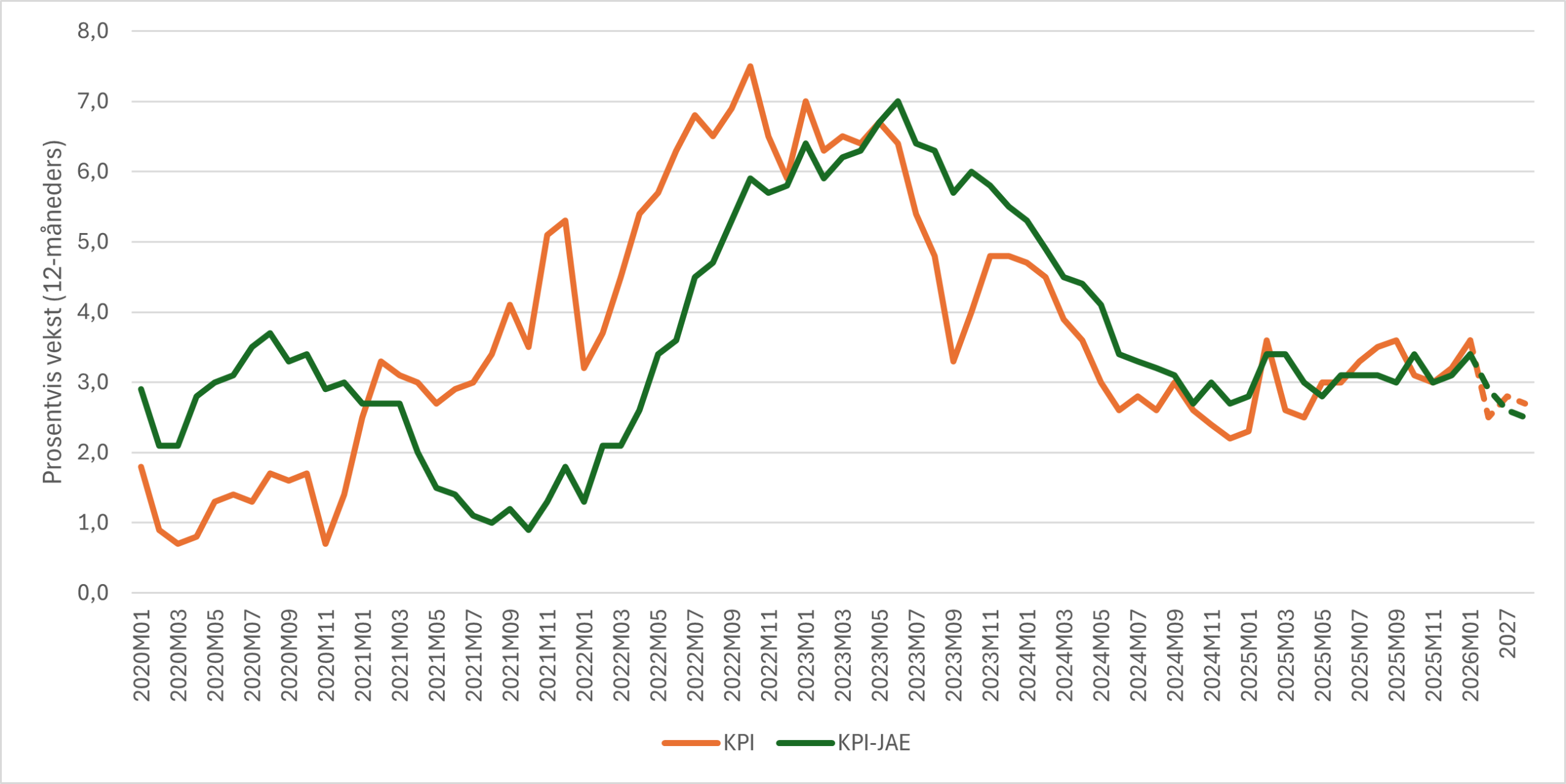 Veksten i konsumprisene (KPI) fra januar 2025 til januar 2026 var på 3,6 prosent. Den underliggende 12-måneders prisveksten (KPI-JAE, justert for energipriser og avgifter) var på 3,4 prosent i samme periode.