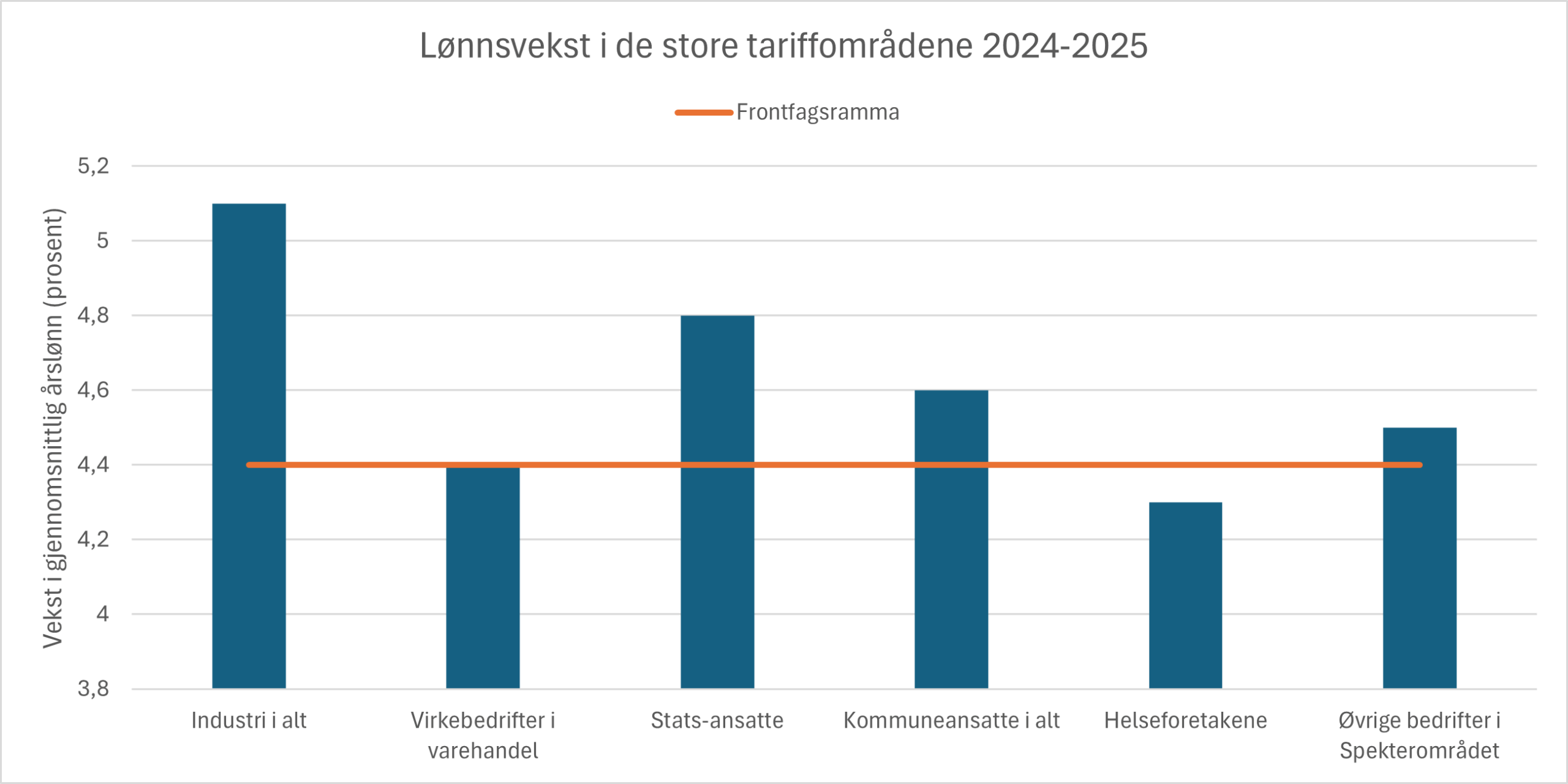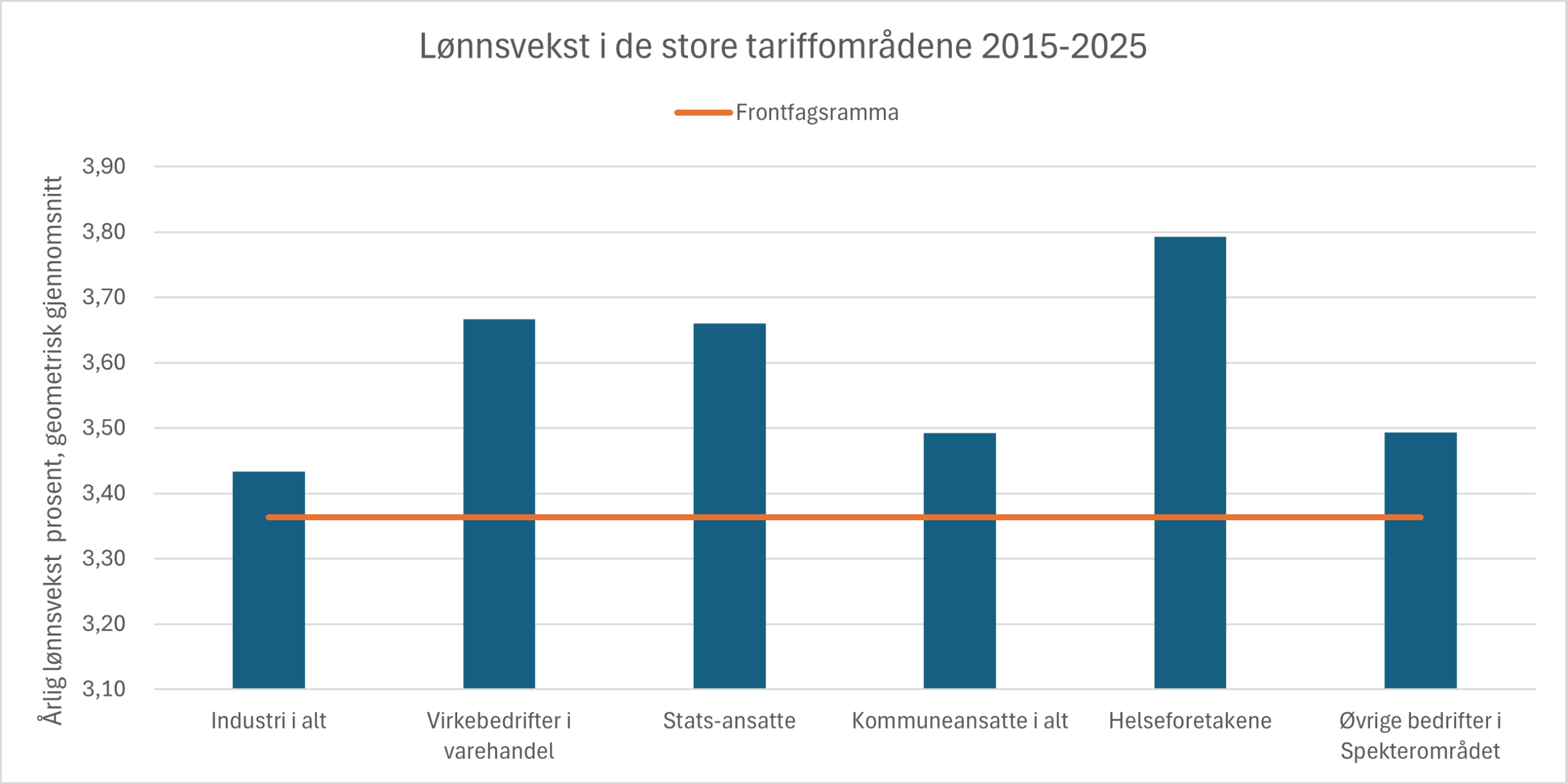 Ser vi på lønnsutviklingen over tid, ser vi imidlertid ikke tendenser til systematiske avvik mellom frontfagsramma og lønnsveksten i industrien. Dette er illustrert i Figur 3 som viser lønnsutviklingen i sektorene i et tiårsperspektiv. Over tid ligger lønnsutvikling i industrien tett på ramma, og det er ikke tendens til at industrien har høyere lønnsvekst enn andre sektorer.